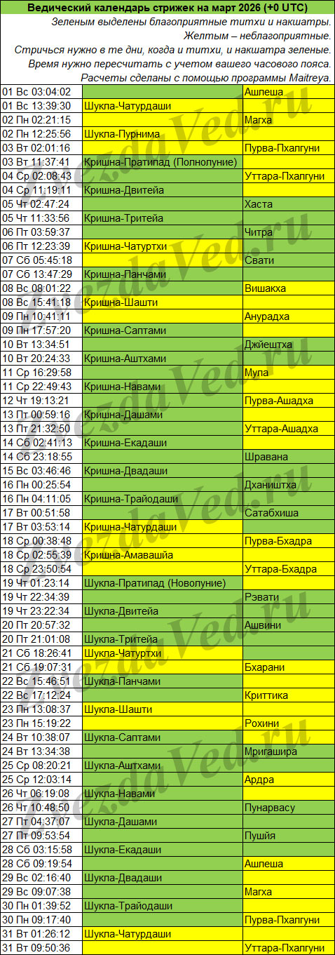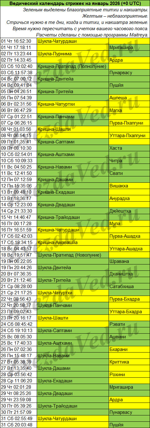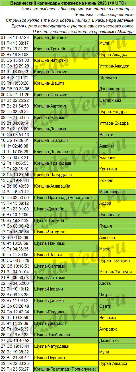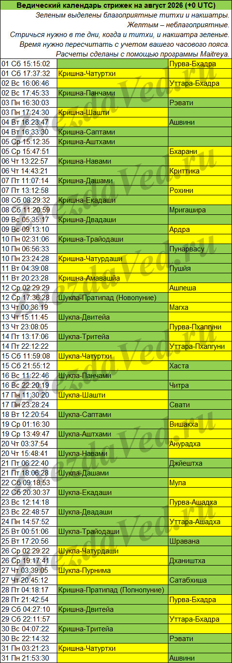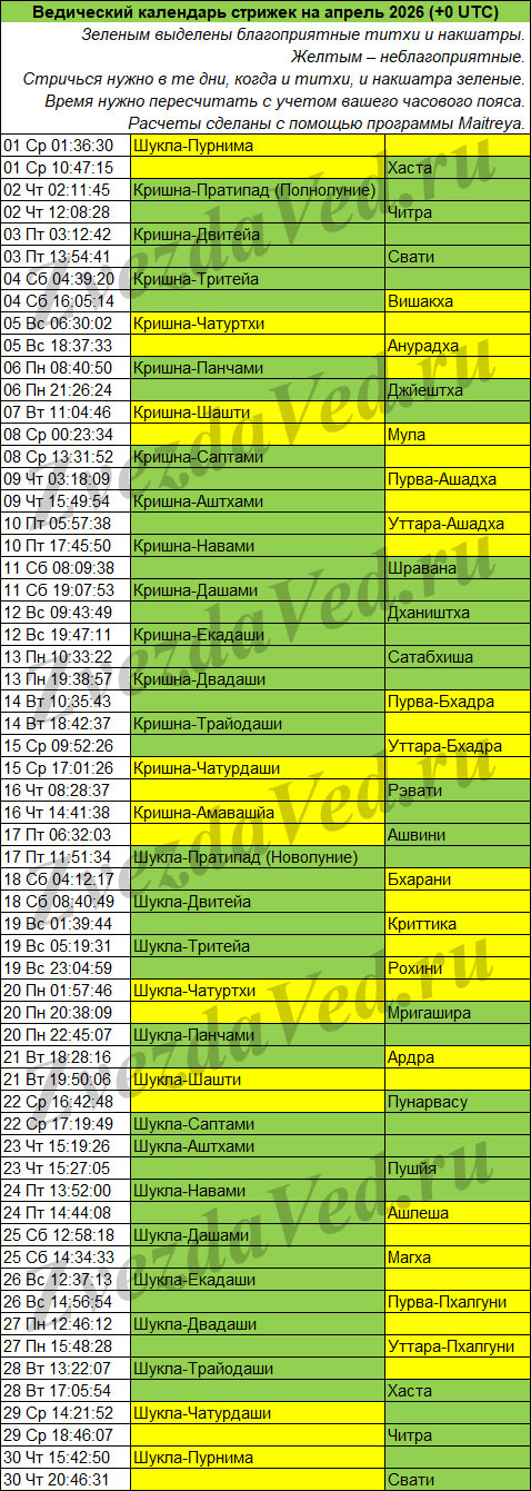 Ведический календарь стрижек основан на движении Луны и зависит от лунных дней (титхи) и созвездий (накшатр). Какие-то титхи благоприятны для стрижки, какие-то — нет. То же самое касается накшатр: среди них есть подходящие для похода к парикмахеру и неподходящие. Чтобы выбрать правильный момент для стрижки, нужно исключить все неудачные факторы. Сделать это можно с помощью календаря. Зеленым фоном в нем выделены благоприятные титхи и накшатры, желтым — неблагоприятные. Стрижку нужно делать в те часы, когда и титхи, и накшатра разрешают это (отмечены зеленым).