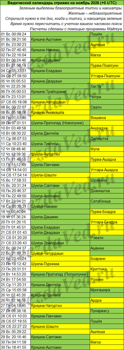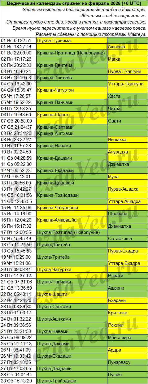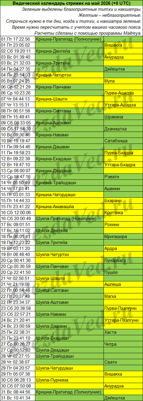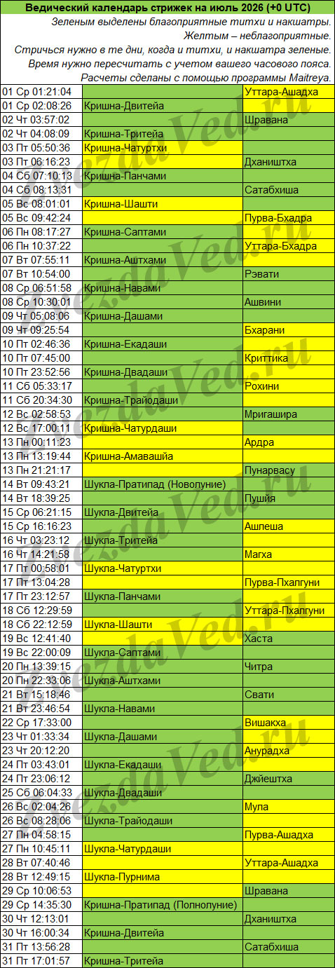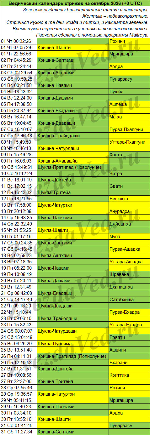 Ведический календарь стрижек основан на движении Луны и зависит от лунных дней (титхи) и созвездий (накшатр). Какие-то титхи благоприятны для стрижки, какие-то — нет. То же самое касается накшатр: среди них есть подходящие для похода к парикмахеру и неподходящие. Чтобы выбрать правильный момент для стрижки, нужно исключить все неудачные факторы. Сделать это можно с помощью календаря. Зеленым фоном в нем выделены благоприятные титхи и накшатры, желтым — неблагоприятные. Стрижку нужно делать в те часы, когда и титхи, и накшатра разрешают это (отмечены зеленым).