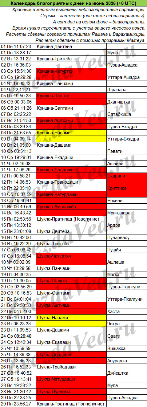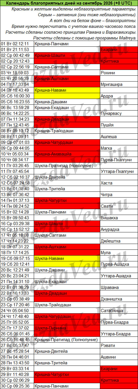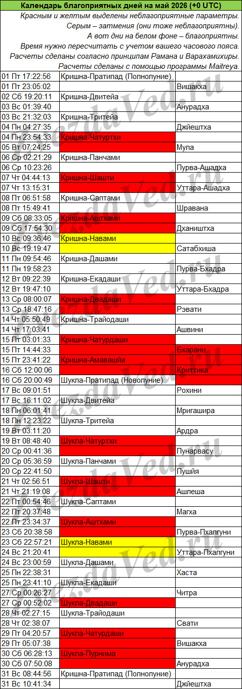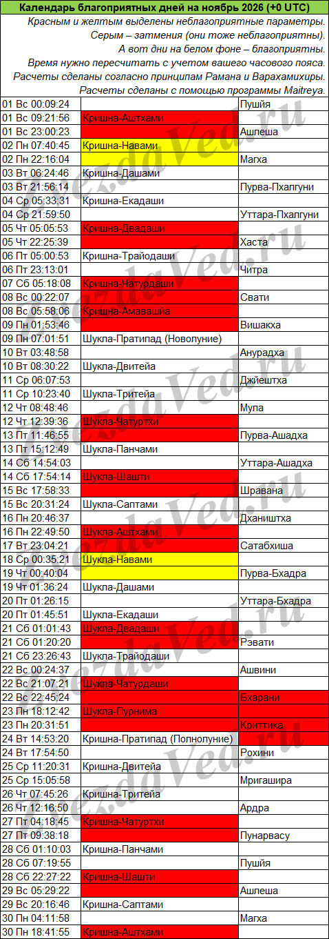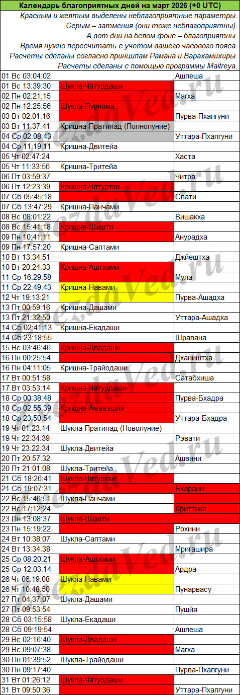 Календарь неблагоприятных дней на этом сайте учитывает ежемесячные события: лунные дни (титхи), прохождение Луны по накшатрам, а также затмения, которые бывают не каждый месяц, но обязательно несколько раз в год.