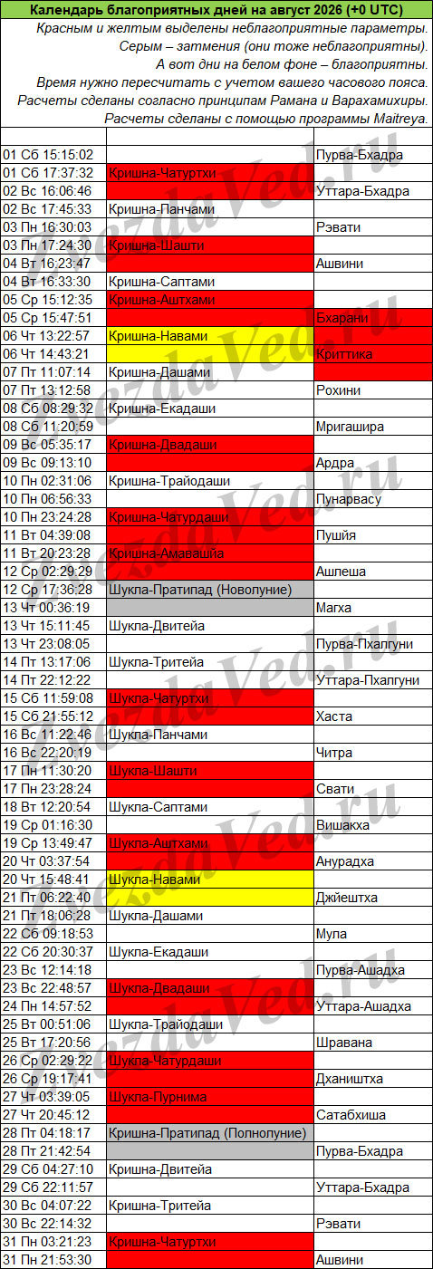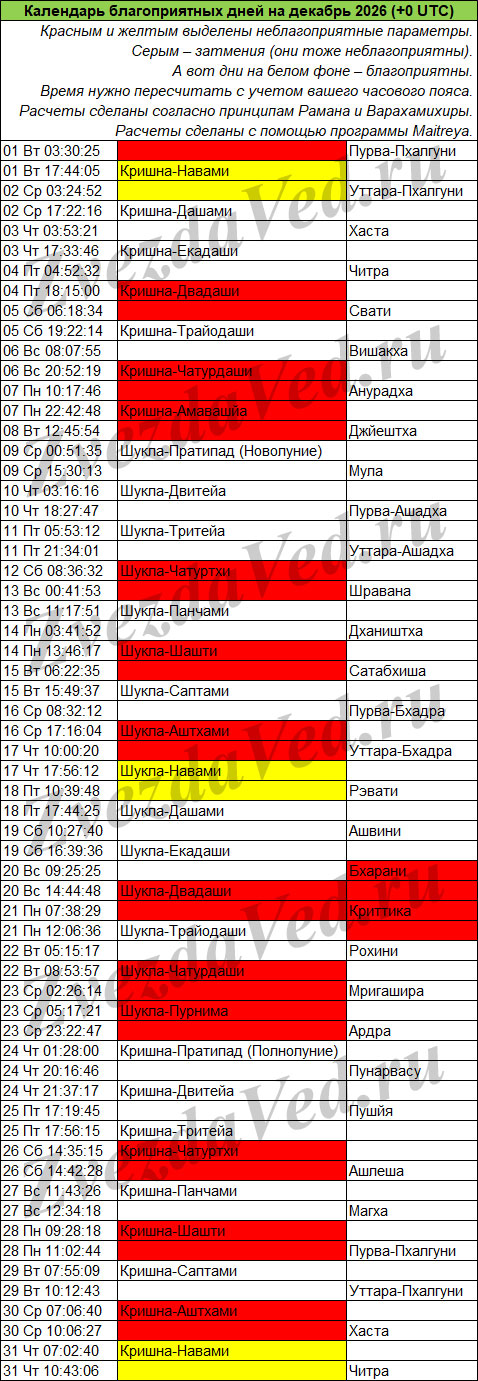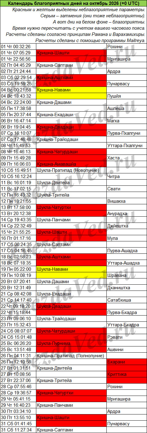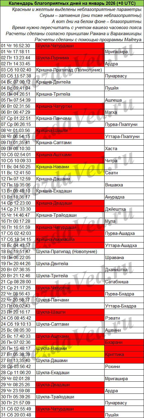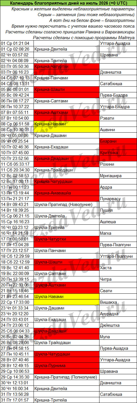 Календарь неблагоприятных дней на этом сайте учитывает ежемесячные события: лунные дни (титхи), прохождение Луны по накшатрам, а также затмения, которые бывают не каждый месяц, но обязательно несколько раз в год.
