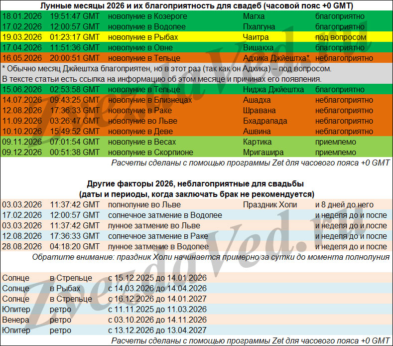 В ведической астрологии существуют моменты, которые НЕ подходят для вступления в брак. Они перечислены в таблицах ниже (для текущего года). Выбирайте для регистрации отношений дни и периоды, которых нет в списке, это увеличит шансы на то, что ваша семейная жизнь будет легкой и приятной (ну или хотя бы не очень тяжелой). Ниже вы можете найти все необходимые пояснения к таблицам.