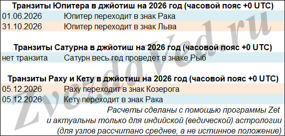 Вам также может быть интересна статья «Транзиты джйотиш в этом году», в ней транзиты и другие астрологические события (затмения, ретропланеты и т.д.) скомпонованы по месяцам — отдельно для января, отдельно для февраля и т.д.