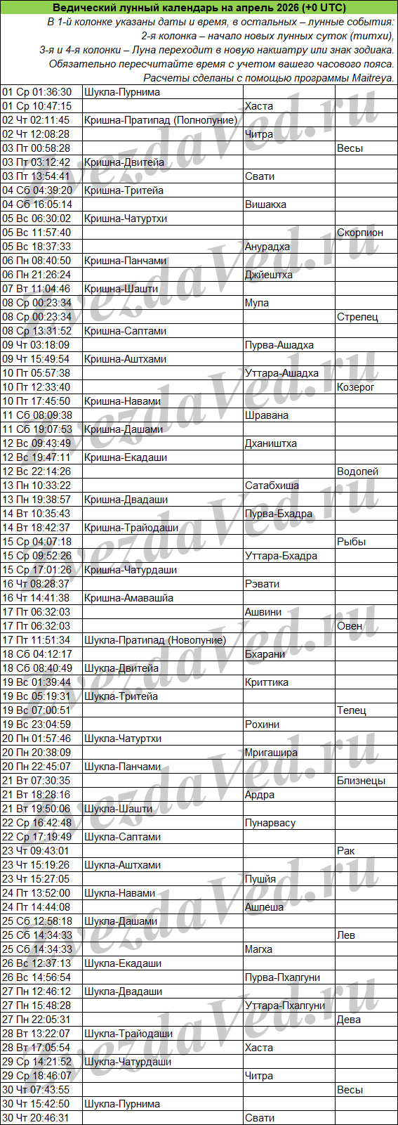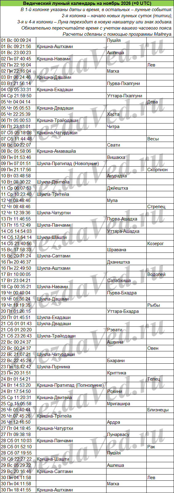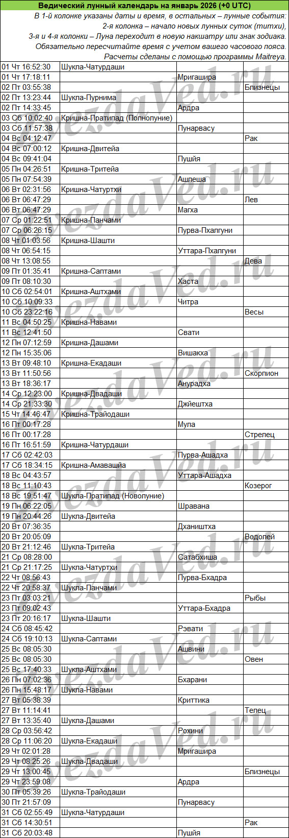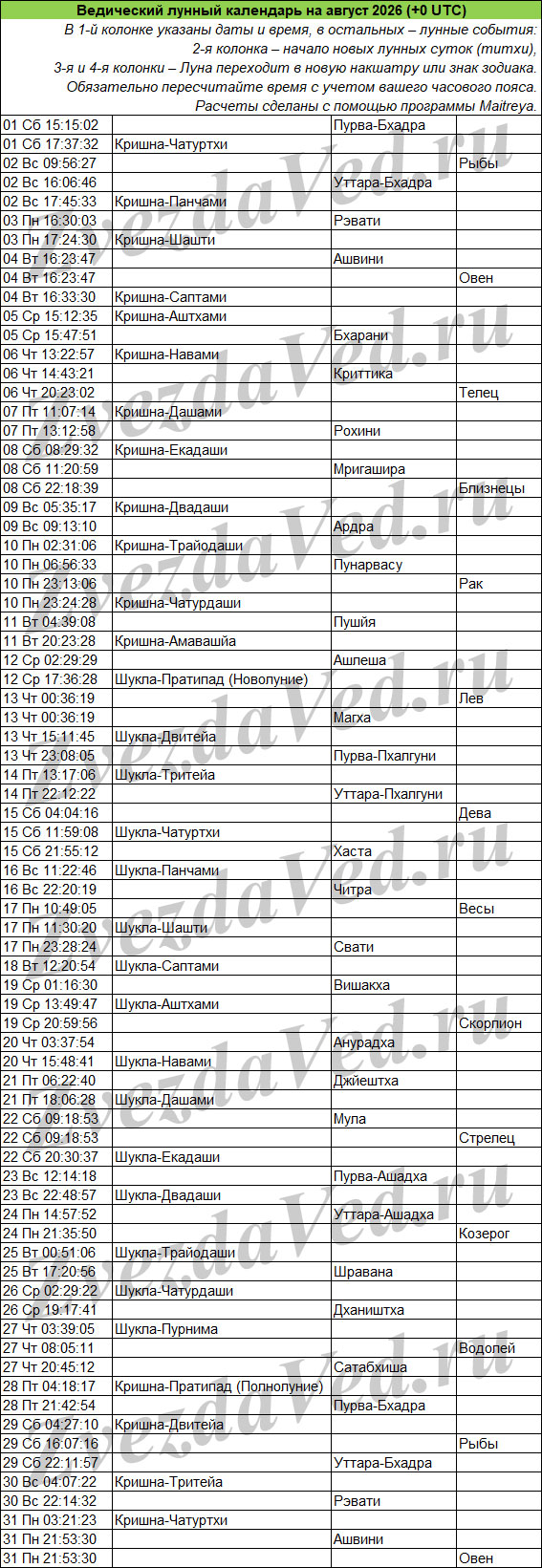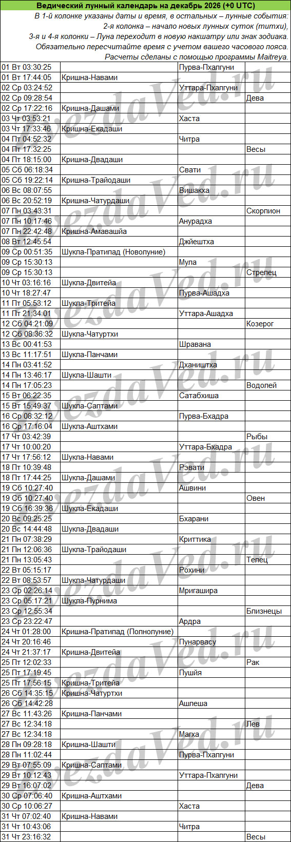 Ведический лунный календарь — понятие масштабное и неопределенное. Оно может включать в себя и перечень лунных дней (титхи), и даты прохождения Луны по знакам зодиака и накшатрам. На этой странице представлены ежемесячные календари, в которых объединены все эти сведения. Они полезны для решения разных задач: помогают выбирать благоприятные дни для начинаний, для стрижек, контролировать свои эмоции и правильно реагировать на поведение окружающих.