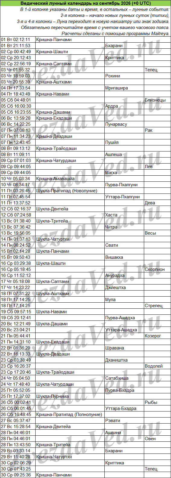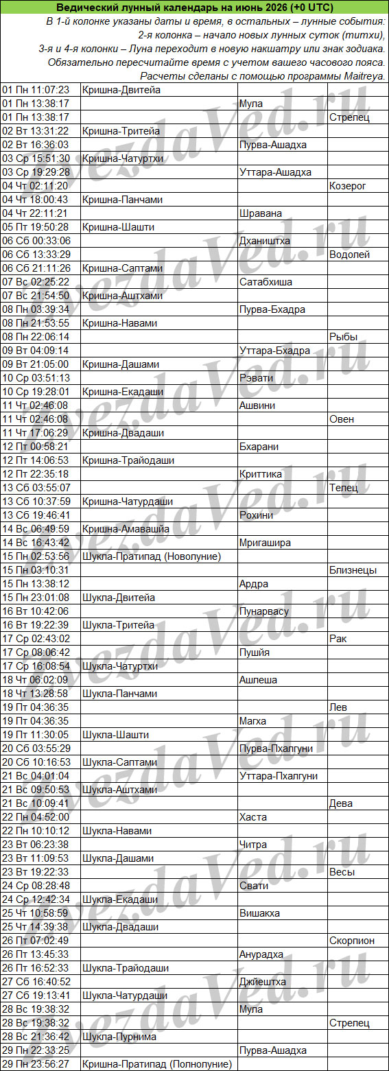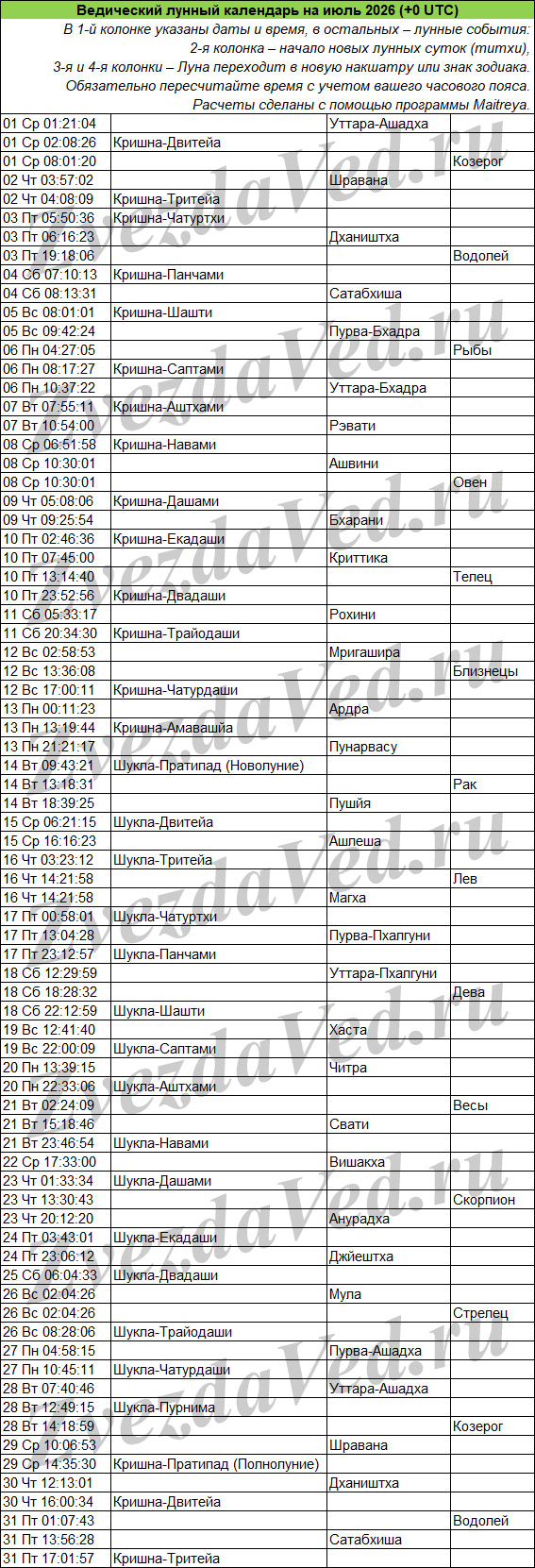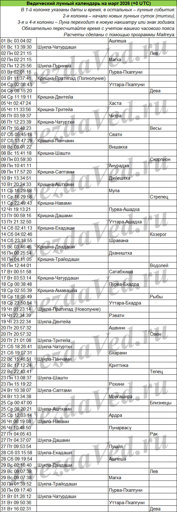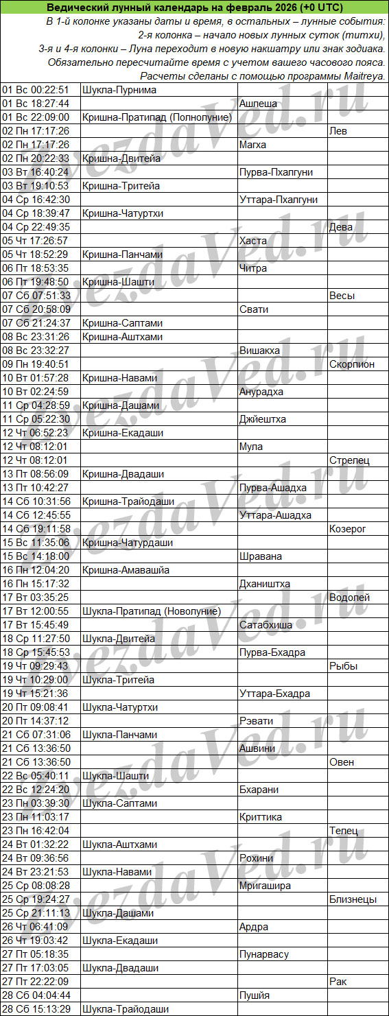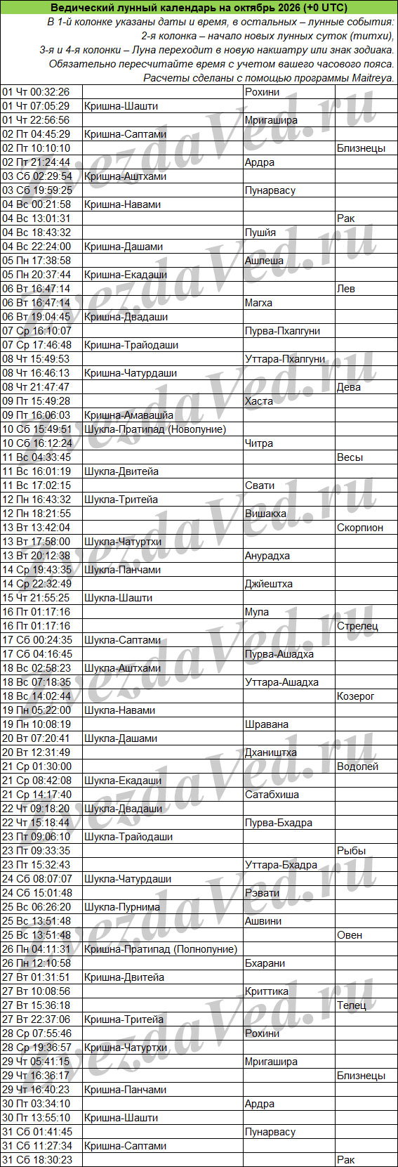 Ведический лунный календарь — понятие масштабное и неопределенное. Оно может включать в себя и перечень лунных дней (титхи), и даты прохождения Луны по знакам зодиака и накшатрам. На этой странице представлены ежемесячные календари, в которых объединены все эти сведения. Они полезны для решения разных задач: помогают выбирать благоприятные дни для начинаний, для стрижек, контролировать свои эмоции и правильно реагировать на поведение окружающих.
